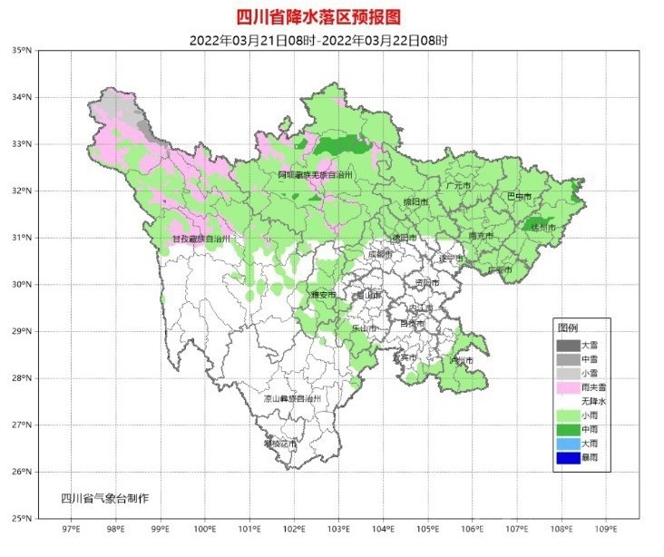 21日白天到晚上,盆地各市陰天間多云,廣元、綿陽(yáng)、德陽(yáng)、巴中、達(dá)州、南充、廣安、瀘州、雅安9市和成都西部、樂(lè)山南部有小雨,其中達(dá)州局部有中雨;阿壩州和甘孜州北部、涼山州東北部多云間陰有陣雨(雪),局地中雨(雪),甘孜州南部和攀西其余地方多云見晴。