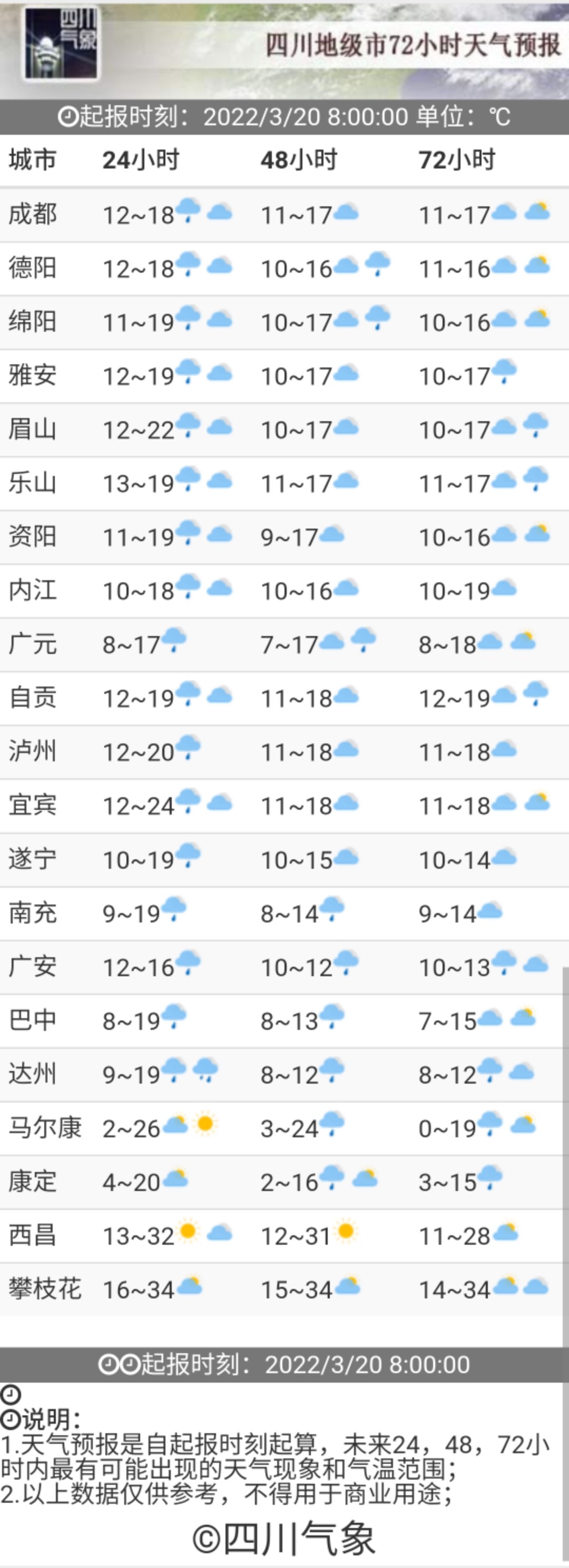 早在3月18日,四川省氣象臺(tái)便發(fā)出了強(qiáng)降溫黃色預(yù)警。預(yù)計(jì)19日傍晚~22日,盆地和涼山州東北部將有一次明顯的降溫降雨天氣過(guò)程,日平均氣溫將累計(jì)下降7~12℃,最高氣溫將下降15℃或以上;冷空氣影響時(shí)有3-5級(jí)偏北風(fēng),山口河谷風(fēng)力可達(dá)6級(jí)或以上,局部地方有短時(shí)強(qiáng)降水、雷暴大風(fēng)或冰雹等強(qiáng)對(duì)流天氣,其中盆地東北部、中部和南部有大雨到暴雨。