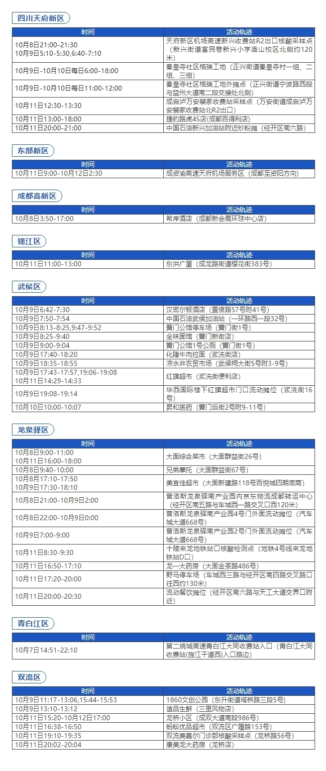 近期新增感染者在蓉軌跡現(xiàn)公布如下,如與以下活動軌跡有重疊,立即向社區(qū)和單位(或居住的酒店)報備,三天內(nèi)接受三次核酸檢測(間隔24小時),期間做好個人防護(hù),不聚會、不聚餐。如有疑問,請撥打12345咨詢。