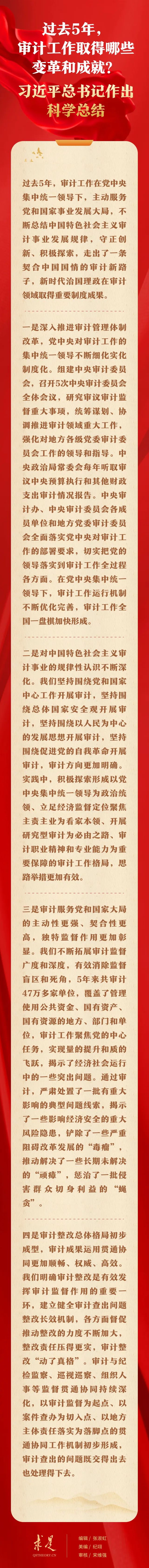 11月1日出版的第21期《求是》雜志刊發(fā)習(xí)近平總書記重要文章《在二十屆中央審計(jì)委員會(huì)第一次會(huì)議上的講話》。在這篇重要文章中,習(xí)近平總書記從4個(gè)方面對(duì)過去5年的審計(jì)工作進(jìn)行科學(xué)總結(jié),強(qiáng)調(diào):“審計(jì)工作取得的這些變革和成就,是新時(shí)代中國特色社會(huì)主義思想在審計(jì)領(lǐng)域的具體實(shí)踐,彰顯了黨的創(chuàng)新理論的真理力量,具有鮮明的時(shí)代性和實(shí)踐性。要總結(jié)好、運(yùn)用好黨關(guān)于新時(shí)代審計(jì)工作的理論成果和實(shí)踐成果,長期堅(jiān)持并不斷豐富發(fā)展,指導(dǎo)審計(jì)工作實(shí)現(xiàn)更大作為?!?/p>