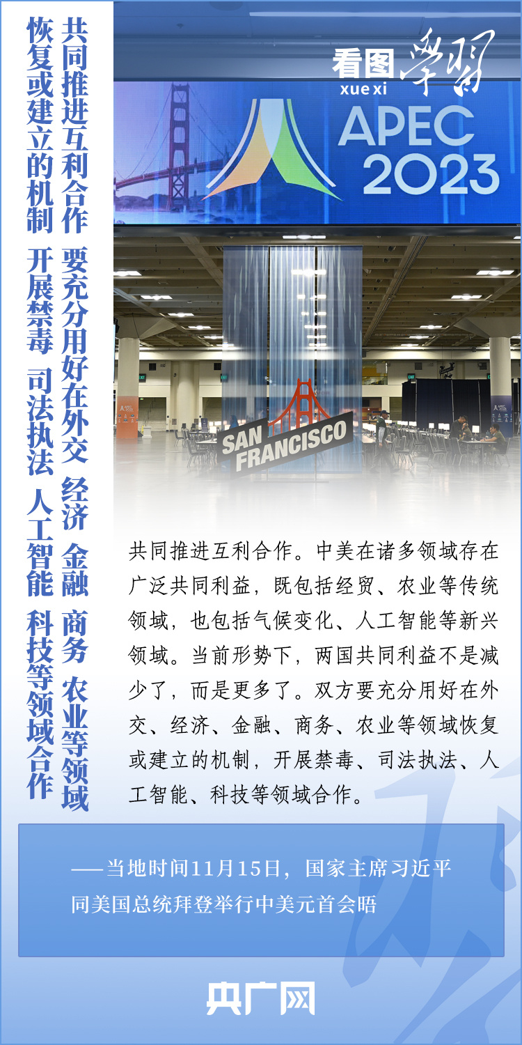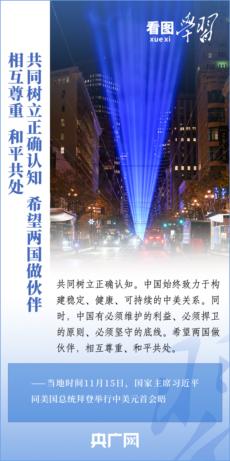 當(dāng)?shù)貢r(shí)間11月15日,國(guó)家主席習(xí)近平在美國(guó)舊金山斐洛里莊園同美國(guó)總統(tǒng)拜登舉行中美元首會(huì)晤。兩國(guó)元首就事關(guān)中美關(guān)系的戰(zhàn)略性、全局性、方向性問題以及事關(guān)世界和平和發(fā)展的重大問題坦誠深入地交換了意見。習(xí)近平主席指出,大國(guó)競(jìng)爭(zhēng)解決不了中美兩國(guó)和世界面臨的問題。這個(gè)地球容得下中美兩國(guó)。中美各自的成功是彼此的機(jī)遇。一起來學(xué)習(xí)!