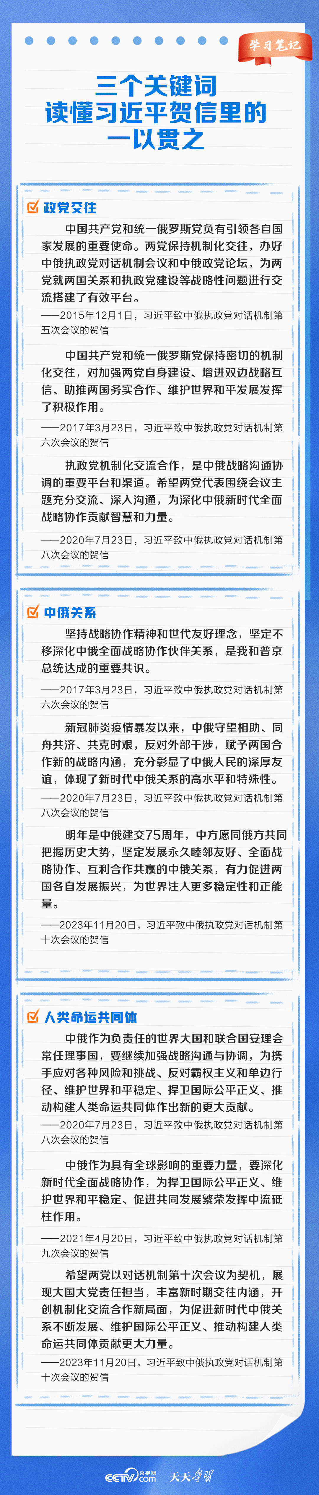 天天學習11月20日,中俄執(zhí)政黨對話機制第十次會議以視頻方式舉辦。習近平總書記同普京總統(tǒng)分別向會議致賀信。習近平總書記在賀信中強調(diào),中俄執(zhí)政黨對話機制已發(fā)展成為兩國鞏固政治互信、密切戰(zhàn)略協(xié)作、推進互利合作的獨特渠道和平臺。