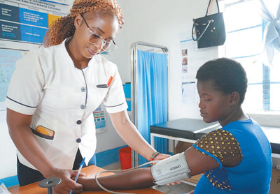 穆薩烏(左)為一名當?shù)卦袐D測量血壓。