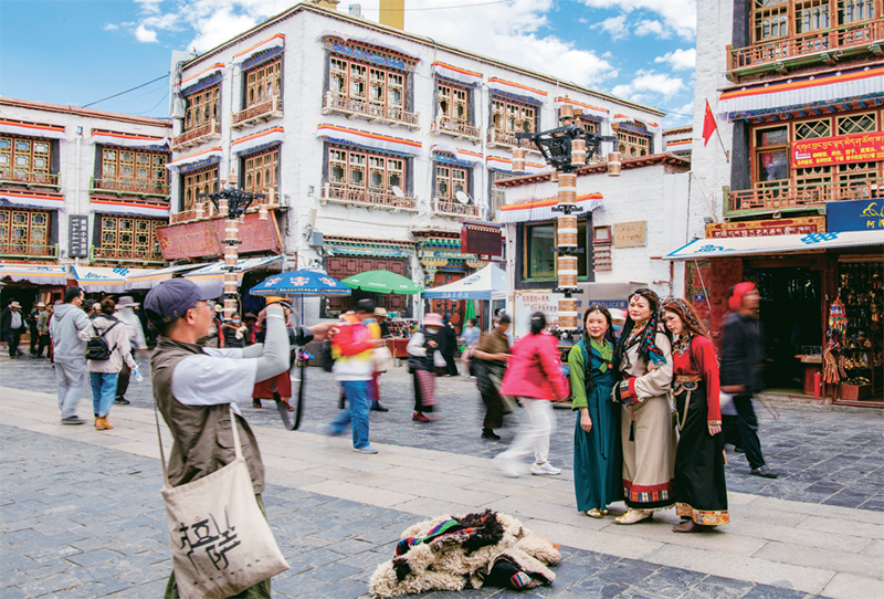 千年八廓街,見證民族團結。2021年7月,習近平總書記來到位于西藏拉薩老城區(qū)的八廓街,感慨地說:“千年八廓街,是我們各民族建起來的八廓街。各民族文化在這里交流交往交融,我們中華民族的大家庭在這里其樂融融?!眻D為2023年6月13日,游客身著藏裝在八廓街拍照留念。 新華社記者 姜帆/攝