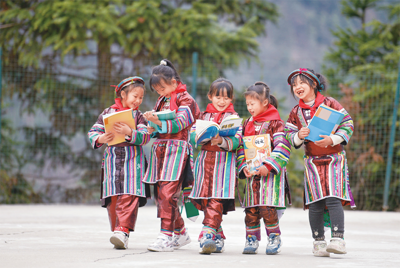 位于貴州省黔東南苗族侗族自治州從江縣大山深處的西山鎮(zhèn)中寨教學點,是一所全校均為瑤族學生的“微小學”。近年來,隨著教學條件逐漸改善,學校發(fā)生了翻天覆地的變化。圖為2023年2月16日,領到新書的瑤族學生在一起交流。 新華社記者 楊文斌/攝