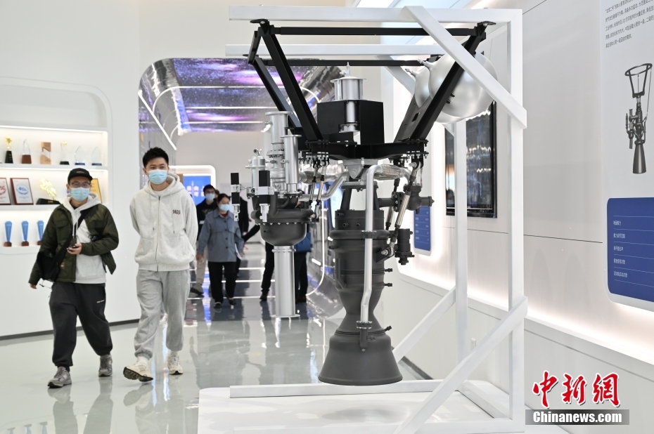 中科空天飛行科技產(chǎn)業(yè)化基地在廣州南沙投產(chǎn)。圖為中科空天飛行科技產(chǎn)業(yè)化基地展廳展示的液體發(fā)動機(jī)模型吸引參觀者。 中新社記者 陳楚紅 攝