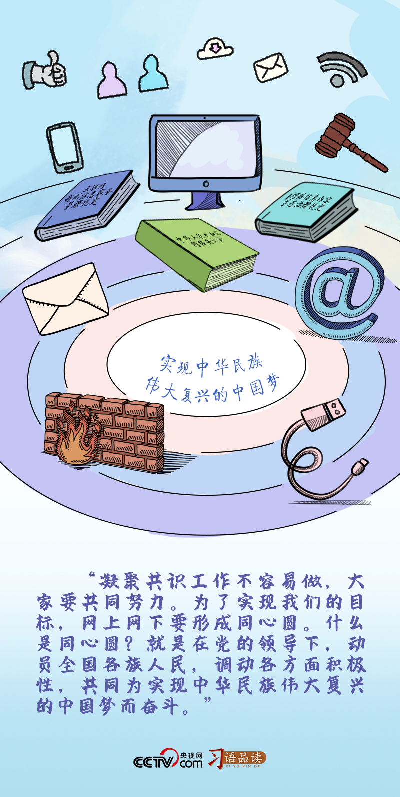 “同心圓”象征著網(wǎng)絡(luò)空間和現(xiàn)實世界的和諧統(tǒng)一,圓的半徑正是政策、法律、法規(guī)等秩序和規(guī)則。繪就網(wǎng)上網(wǎng)下同心圓,圓的半徑不能走樣。