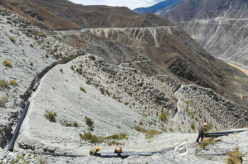 在曲雅貢鄉(xiāng)真康壩取水點(diǎn)半山腰,工人正在鋪建水管。