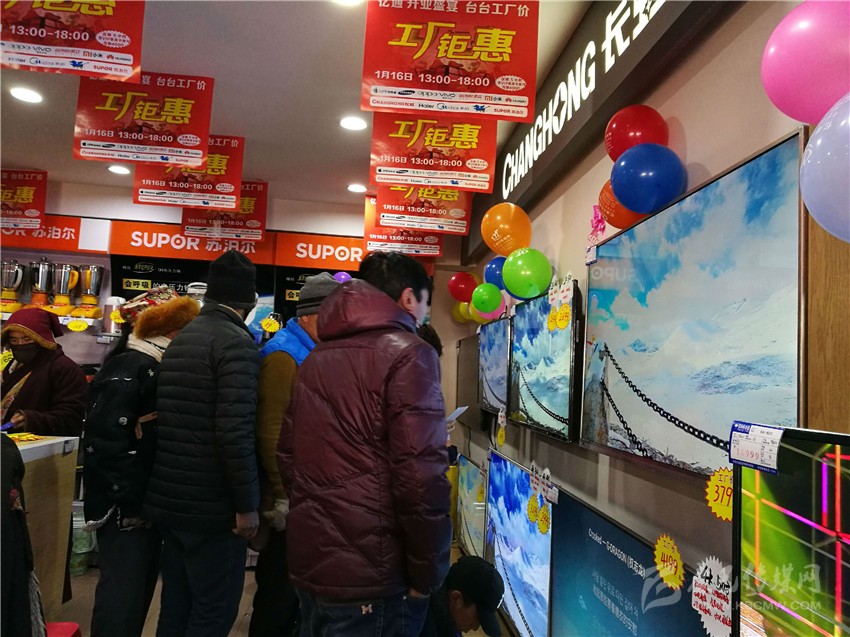 在甘孜縣的超市里,以年貨為主打的商品琳瑯滿目,滿眼可見(jiàn)迎新大禮包、過(guò)年促銷(xiāo)廣告。