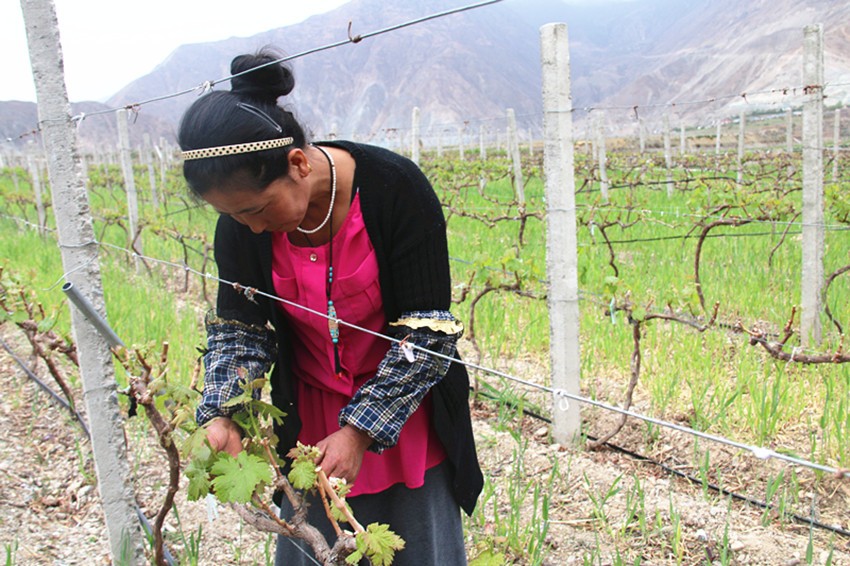 四郎吉村地處半山腰,干旱缺水、土地貧瘠,村民們以前都靠種植青稞來獲得收入?!斑^去,由于缺技術(shù)、葡萄的品質(zhì)不高,我家種的釀酒葡萄賣不出去;現(xiàn)在,太陽魂公司承包了村民們的葡萄園,成立專業(yè)合作社,統(tǒng)一種植、統(tǒng)一管理、統(tǒng)一經(jīng)營,既規(guī)避了風(fēng)險(xiǎn),又為大家?guī)砹撕芎玫慕?jīng)濟(jì)效益。”對于村民仁青志瑪來說,生活的好轉(zhuǎn)都起因于小小的葡萄。
