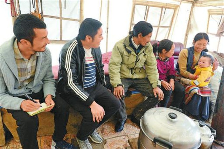 ②雷旭(左二)和群珠(左一)來到與合作社簽約的牧民家中了解情況。