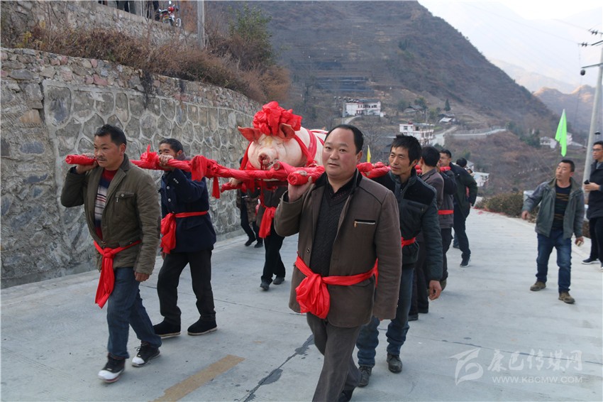 5個村民將年豬抬到秤上。360斤。村民為年豬準備大紅花。準備紙錢、香蠟。9點整,殺豬匠開始了他的工作,在眾人齊心協(xié)力下,光溜溜的年豬被打整干凈?!氨S游覀兇鍋砟觑L調(diào)雨順、五谷豐登,村民平安健康?!贝逯欣险呔催^天地后,8個身強力壯的村民站在年豬旁,豎著拇指齊聲說,今年家家戶戶還要養(yǎng)大肥豬。抬著年豬,村里的中老年人簇擁著,走在最前面,唱著悅耳的民謠,大意是歌唱幸福生活的,迎著2018年的第一縷陽光,村民們喜氣洋洋。到村里來的游客蜂擁拍照。