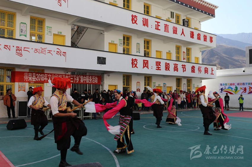 上午11點(diǎn),歡快的音樂在小學(xué)操場上響起,演出正式開始。村民們圍坐在操場上,人頭攢動、彩幡飛舞、陽光正好。13個(gè)節(jié)目依次上演,包括男女群舞、女子群舞、男子合唱、女子合唱、男女獨(dú)唱,最有特色的是得榮本地特色群舞《雪域鍋莊》和《九步情》。
