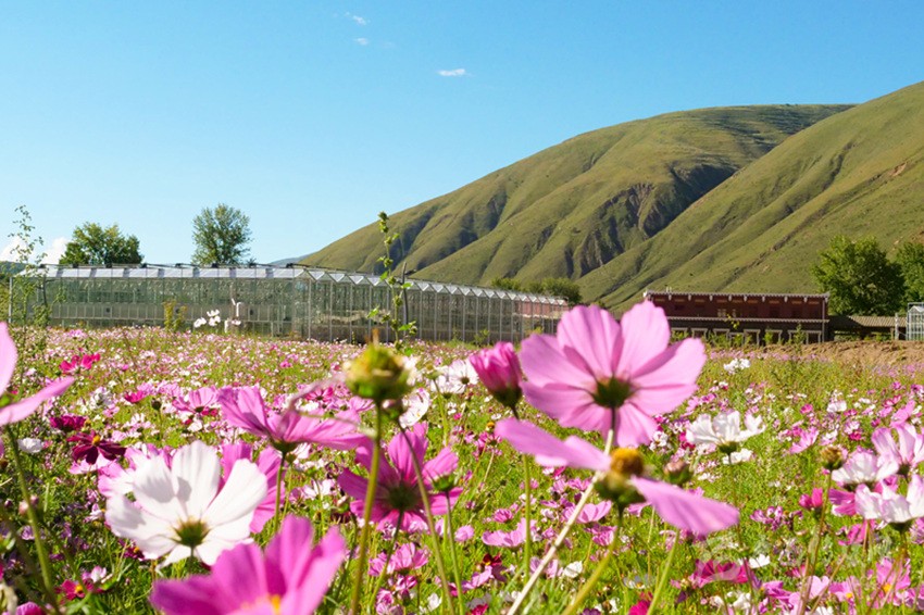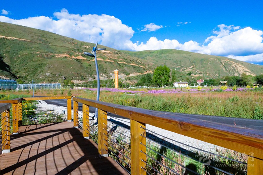 陽(yáng)光下,成片開(kāi)放的波斯菊搖曳生姿,成片白楊林包圍著12個(gè)16—25平方米不等的仿道孚民居外觀的樹(shù)屋,沿著鵝卵石鋪設(shè)、牡丹點(diǎn)綴的棧道漫步,兩側(cè)種植著落葉松、金葉垂榆、康定木蘭、五小葉槭等32種具有高原特色的植物,樹(shù)下種植以虞美人、百葉菊等17種花卉為主的草本植物;來(lái)到湖心島,不少人坐在其間休閑,有的坐在樹(shù)下乘涼,有的坐在溪邊聊天,還有不少人在伸臂橋上照相,不遠(yuǎn)處透明的玻璃溫室展覽館已經(jīng)完成建設(shè),走過(guò)開(kāi)滿(mǎn)桃花的拱形門(mén),陽(yáng)光灑在地面上讓人心生暖意,廢棄的水塔變成了打酥油茶用的醬桶,山、水、溪、樹(shù)、花、屋構(gòu)成了不同意境的高原園林景觀。