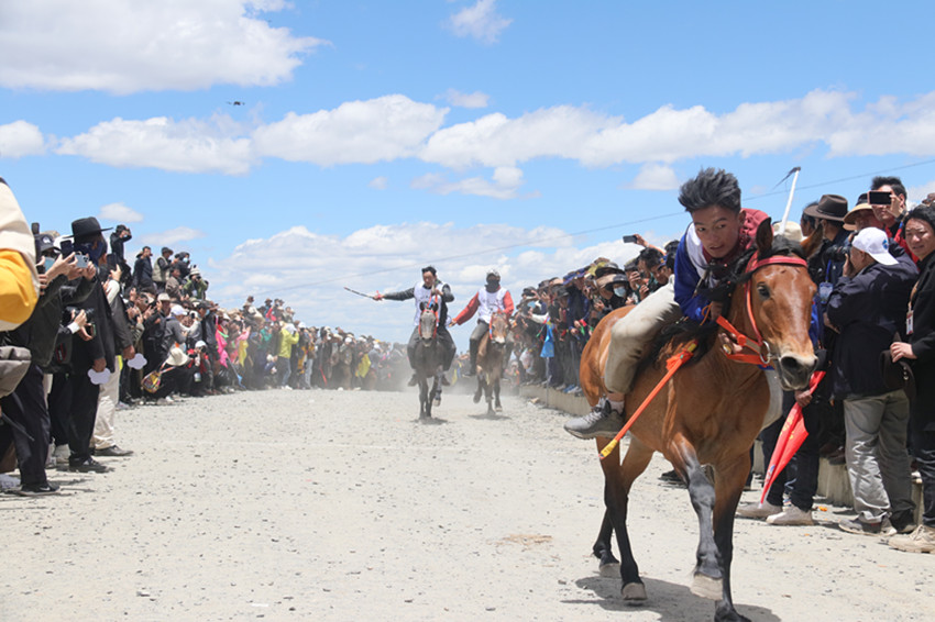 雪山潔白、青稞碧綠,雪白的貢嘎海棠搖曳在枝頭,目之所及,皆是風景。騎手騎著自己心愛的馬兒,一個個英姿颯爽、神采飛揚。隨著發(fā)令員的口號響起,駿馬像離弦的箭一樣飛奔出去,騎手們全都鉚足了勁,勢必要在比賽中拔得頭籌。賽道上的駿馬你追我趕,賽道邊慕名前來的游客和周邊村民吶喊加油,跑出了甘孜兒女奮發(fā)向上、積極進取的精神風貌。