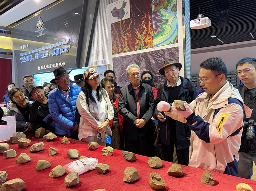 來(lái)自省內(nèi)外學(xué)術(shù)界和演藝界的甘孜名人戴上手套近距離觸摸石器物品所傳達(dá)的歷史溫度。
