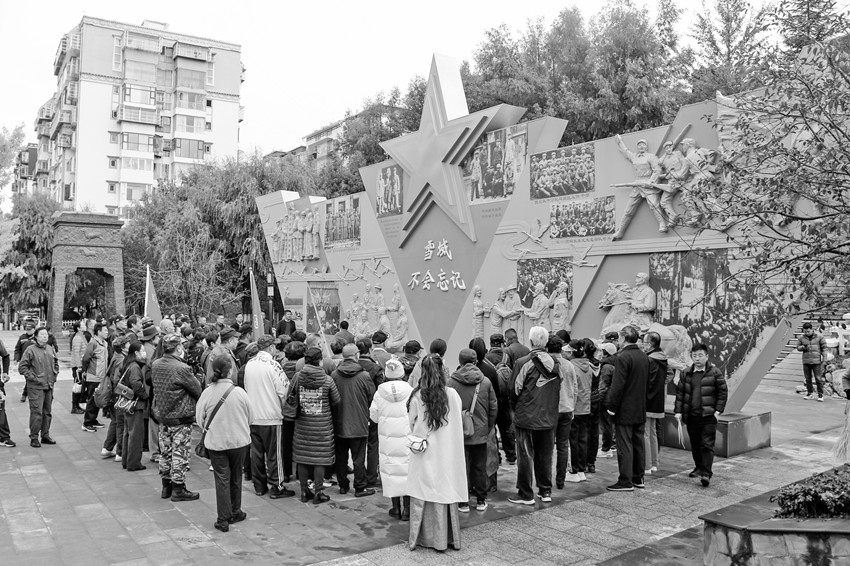 10月27日,原中國(guó)人民解放軍第62軍和西北入川工作團(tuán)赴康南下干部的后代們前往新城情歌公園,參觀瞻仰2022年11月落成的“雪域不會(huì)忘記——康定和平解放暨南下干部入康紀(jì)念浮雕墻”,雕像墻通過(guò)浮雕和珍貴圖片,生動(dòng)展現(xiàn)了70多年前康定解放的歷史場(chǎng)景?;顒?dòng)現(xiàn)場(chǎng),大家懷著對(duì)革命先輩們無(wú)比崇敬的心情敬獻(xiàn)鮮花。