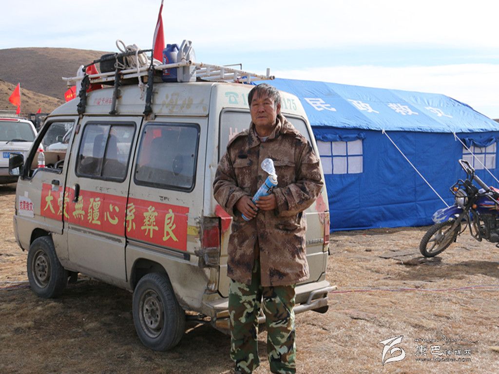 26日下午,震后第四天,記者在塔公鄉(xiāng)木雅祖慶小學臨時安置點采訪時,看見一輛長安面包車靜靜的停在救災帳篷旁,車頂自制的行李架上裝滿了修理汽車的各種工具,車的旁邊站著一位身穿迷彩軍衣,滿臉疲憊的老人,正一邊啃著干饅頭,一邊吸著藥店買的瓶裝氧氣。