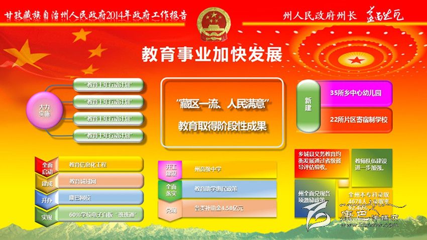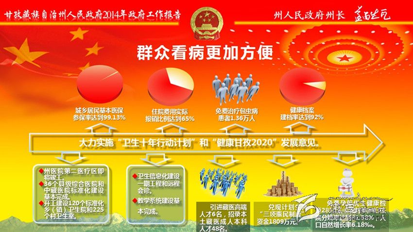 加大民生投入,全年民生支出139億元。全州城鎮(zhèn)新增就業(yè)7400人,城鄉(xiāng)低保實現(xiàn)應(yīng)保盡保;在全省民族地區(qū)率先實施醫(yī)療保險制度城鄉(xiāng)統(tǒng)籌,異地就醫(yī)即時結(jié)算全面啟動;在全省率先出臺大病醫(yī)療保險規(guī)定。教育事業(yè)加快發(fā)展。新建35所鄉(xiāng)中心幼兒園、22所片區(qū)寄宿制學校,州高級中學開工建設(shè)。全面落實教育助學惠民政策,兌現(xiàn)各類補助金4.58億元。城鄉(xiāng)居民基本醫(yī)保參保率達到99.13%,健康檔案建檔率達到92%;開工建設(shè)120個標準化鄉(xiāng)(鎮(zhèn))衛(wèi)生院和225個村衛(wèi)生室;衛(wèi)生信息化建設(shè)一期工程和遠程會診、教學系統(tǒng)建設(shè)基本完成;兌現(xiàn)計劃生育“三項惠民制度”資金1809萬元。群眾文化生活日益豐富。建成縣“兩館”12個;開工建設(shè)州民族體育館、州農(nóng)牧民演藝培訓中心和14個縣級全民健身中心,建成農(nóng)民體育健身工程739個;開展 “送文化下鄉(xiāng)”近千場;康巴文化研究院“四大工程”全面啟動。深入實施“百千萬康巴英才工程”,人才科技工作扎實有效。扶貧移民工作成效明顯。完成1360個貧困村、19.91萬扶貧對象立卡建檔工作;實施整村推進63個、連片開發(fā)項目4個、彝家新寨(村)17個、索改橋23座,易地扶貧搬遷9850人,2.65萬群眾生產(chǎn)生活條件得到改善。