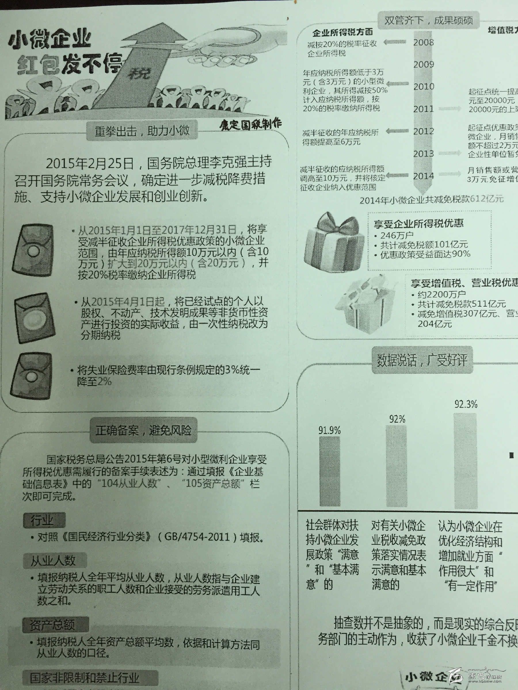 九龍縣國稅局倡導(dǎo)稅務(wù)人員和納稅人代表組建“小微企業(yè)納稅服務(wù)志愿小分隊”,大力宣傳落實小微企業(yè)稅收優(yōu)惠政策,使該局享受小微企業(yè)稅收優(yōu)惠政策的納稅人從124戶增加至133戶,享受面達到100%。