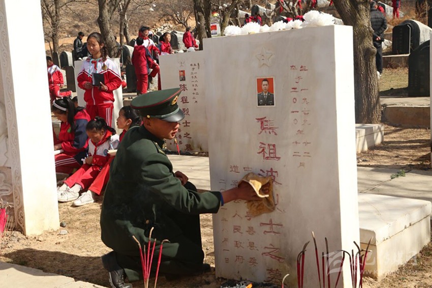 武警戰(zhàn)士清掃墓碑。