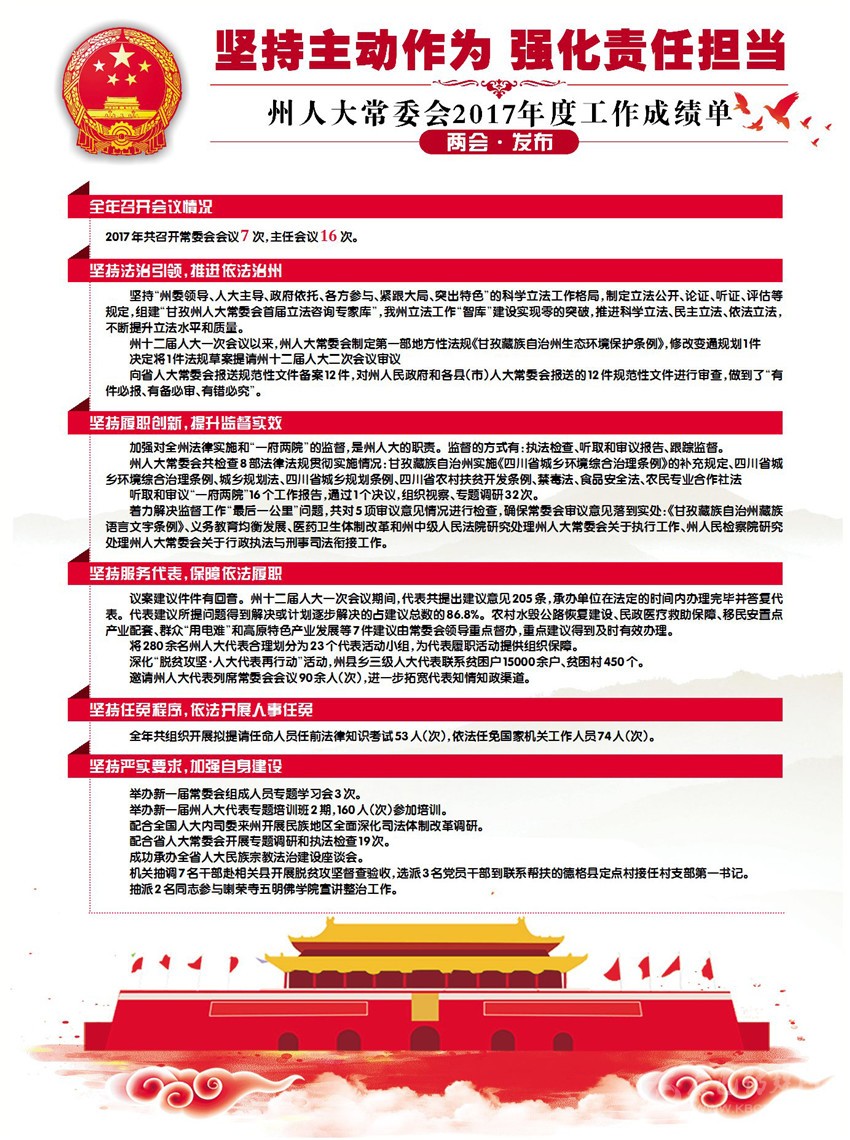 2017年是州十二屆人大常委會(huì)各項(xiàng)工作的開局之年,在中共甘孜州委的堅(jiān)強(qiáng)領(lǐng)導(dǎo)下,常委會(huì)圍繞中心,服務(wù)大局,依法履職,圓滿完成了州十二屆人大一次會(huì)議確定的各項(xiàng)工作任務(wù)。