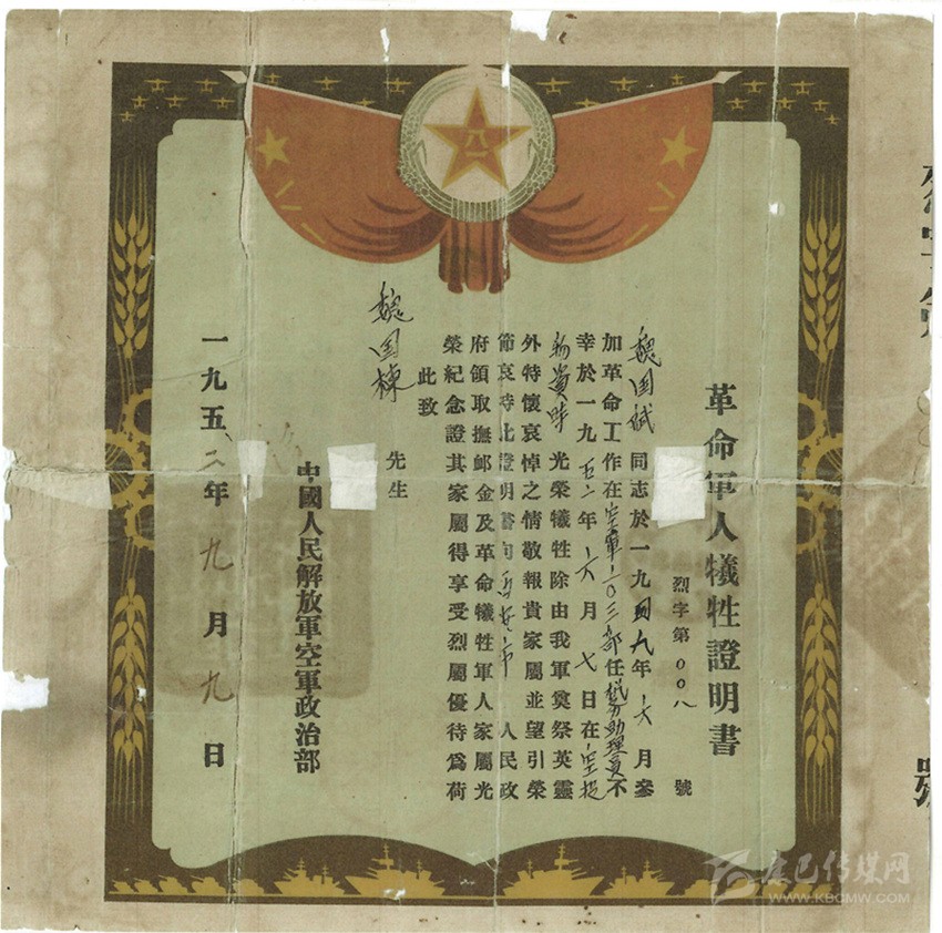 但《革命軍人犧牲證明書》上卻是字字泣血的消息:魏國斌(魏國賓)同志不幸于1952年6月7日?qǐng)?zhí)行西線任務(wù)空投物資時(shí)光榮犧牲。
