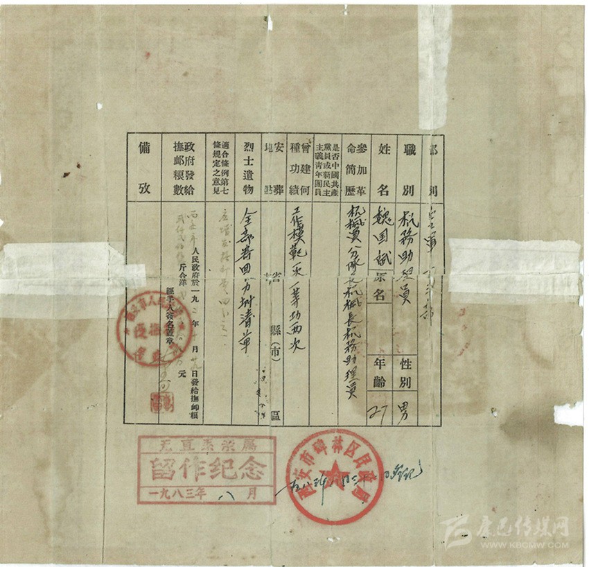 魏國賓的革命軍人犧牲證明書。