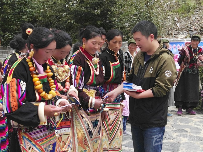 稻城亞丁景區(qū)管理局工作人員向拉木格村村民發(fā)放民族團結宣傳資料。
