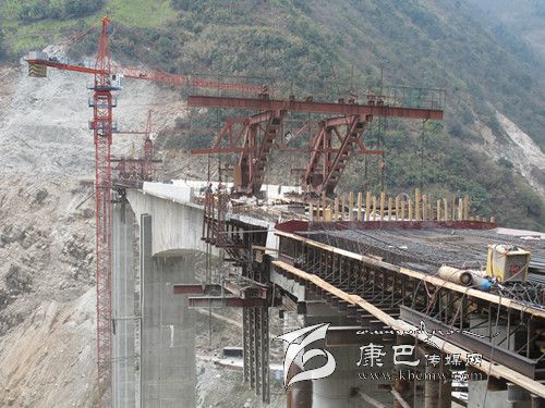 3月12日上午,記者在大崗山水電站S211復(fù)建公路工程(瀘石路)B標(biāo)段跨徑為296米的大渡河大橋(又名灣東大橋)的施工現(xiàn)場看到,高聳的吊裝機(jī)隆隆作響,T梁上鋼筋林立;戴著安全頭盔的施工人員正在精心“編織”鋼筋網(wǎng)陣,掛籃懸臂也同時在澆筑施工,大橋已初具雛形。連接大橋的聯(lián)合村隧道內(nèi),同樣一派忙碌的場面,挖掘機(jī)、運(yùn)輸車等各類工程車往來進(jìn)出,施工便道上馬達(dá)聲轟鳴;正在洞口緊張焊接的鉆孔臺架上劃出一道道閃亮的弧線;隧道內(nèi)燈火通明,工人們正有條不紊地在洞壁上鉆孔……