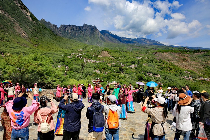 游客在甲居藏寨觀景臺欣賞美景。