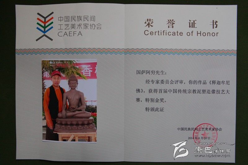 由中國民族民間工藝美術(shù)家協(xié)會主辦的“首屆中國宗教泥塑技藝大賽”,旨在傳承宗教泥塑造像技藝,搭建宗教造像藝術(shù)家展示平臺。本次大賽共有來自臺灣、香港、天津、河北、四川、西藏、云南、浙江、江蘇、貴州、江西、寧夏、江西等地的39名泥塑高手現(xiàn)場制作,角逐獎項。我州的國薩阿窮等三名藝人現(xiàn)場制作的泥塑作品《釋迦牟尼》榮獲特別金獎,同時,國薩阿窮還榮獲了“中國傳統(tǒng)工藝美術(shù)大師(宗教雕塑)”榮譽(yù)證書。