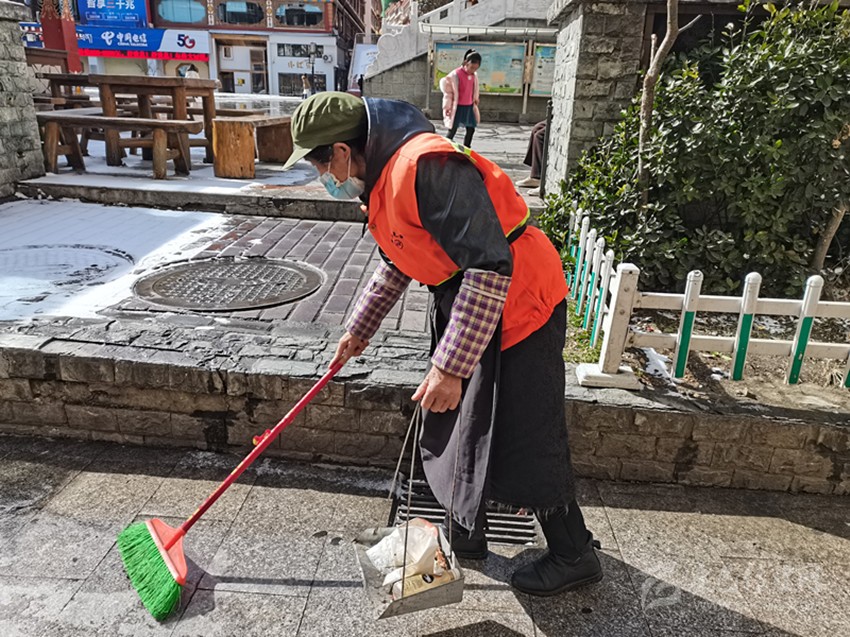 1月30日,農(nóng)歷大年廿九,在康定市的街道,環(huán)衛(wèi)工人宋光芳已穿好工作服,拿著掃帚和撮箕,仔細(xì)地清掃路面。自2012年,宋光芳從事環(huán)衛(wèi)工作,到現(xiàn)在已經(jīng)10個年頭了,在這10年里,她每天早出晚歸,耕耘在環(huán)衛(wèi)工作第一線。為了給市民營造干凈、舒適的節(jié)日環(huán)境,今年春節(jié)她仍和往年一樣堅守在工作崗位上,保證城市干凈衛(wèi)生的環(huán)境。