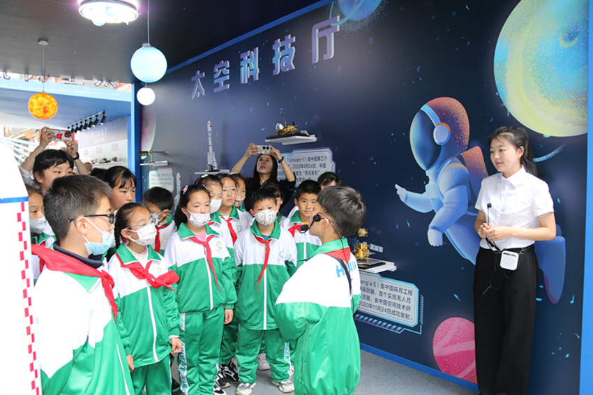 “航天夢是中國夢、華夏夢,神舟十六號載人飛船發(fā)射成功并進入預定軌道。古人仰望星空,幻想上天攬月的夢想,在一代代中國航天人的努力下逐漸變?yōu)榱爽F(xiàn)實。”“紅領巾”講解員劉嘉沐在解說他負責的天空科技廳時,將這一喜訊分享給了在場的同學們?!跋M芙枭裰凼栞d人飛船發(fā)射成功的機會,在科普周活動中普及航天知識,讓更多的學生深入了解航天文化,引導青少年傳承航天精神、點燃航天夢想?!敝菘茀f(xié)負責人告訴記者。