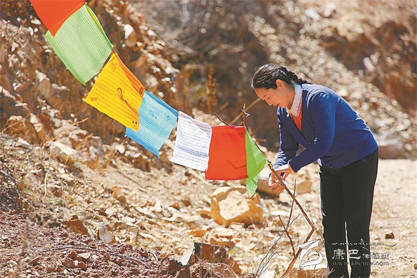 到達益西村布乃格時,杜勒突然發(fā)現(xiàn)前面有十多米路段已經(jīng)被洪流沖垮了一半。“停車!停車!不能再往前開了!”坐在副駕駛座上的杜勒急忙叫住丈夫,從身上斜挎的小包里拿出五六面風馬旗,拉開車門,幾步?jīng)_到了垮塌路段跟前。“不要再過去了,水里有石頭,一會兒被大水沖走了你就完了!”仁孜跟著跳下車,追著她喊。可是杜勒不顧丈夫的呼喊,蹲在垮塌路面的邊緣,伸出雙手將穿滿風馬旗繩子的一端系在路邊山壁的樹枝上。她身子傾斜,右腳伸直踩在被河水沖成斜坡的路基上,左腳彎曲踏著僅剩的一點路面,想將繩子綁得更加牢固。而風馬旗卻不聽使喚的在風雨交加中搖擺不定,杜勒心中此刻只有一個信念:風馬旗上系著的是萬千生命,無論如何也要綁牢實。“你是不是瘋了?路基都空了,要是垮下去你被大水沖走了怎么辦?”仁孜話音剛落,杜勒右腳踩著的那塊泥土突然整塊塌了下去。仁孜一把抓住她的手臂,把她拽了上來。“如果當時是她一個人,那肯定沒命了!”仁孜把她拖回車上才發(fā)現(xiàn),杜勒卷起褲管兒的腿上布滿了青青紫紫的淤痕,雙腳顫顫巍巍,幾乎站不穩(wěn)?;氐娇h城后,醫(yī)生告訴杜勒短時間內(nèi)不能走路,要多休息??墒?,當天下午,杜勒趁仁孜上班,自己找了一根竹棍子拄著,又趕到下一個坍塌路段做著重復的工作。
