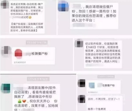 不少網(wǎng)友的微信都會(huì)收到類(lèi)似“xxx你好,清理下朋友圈,效果不錯(cuò)。真是不清不知道,一清嚇一跳。需要清理可加微信***”這樣的信息,表示可以通過(guò)專(zhuān)業(yè)手段找到所有刪除、拉黑、或屏蔽自己的“僵尸粉”,清理微信的聯(lián)系人,可以“釋放手機(jī)內(nèi)存”。