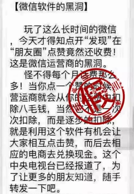 事實(shí)上,這是一條傳播已久的老謠言。此前,“@騰訊用戶(hù)服務(wù)”官方微博回應(yīng)稱(chēng)傳聞純屬謠言:“朋友圈點(diǎn)贊要扣話(huà)費(fèi)。怎么可能!免費(fèi)好不好!朋友圈要的就是小伙伴們的情感互動(dòng),情誼無(wú)價(jià)!”中國(guó)聯(lián)通的工作人員也介紹,運(yùn)營(yíng)商的每一項(xiàng)常規(guī)收費(fèi),都會(huì)按照雙向通知的原則,即提示客戶(hù)所使用的某項(xiàng)業(yè)務(wù)會(huì)收費(fèi),待客戶(hù)確認(rèn)了解并同意后才能收費(fèi),所以微信點(diǎn)贊會(huì)被扣話(huà)費(fèi)是謠言。記者了解到,“點(diǎn)贊扣話(huà)費(fèi)“屬于“微信X月X日即將收費(fèi)”這類(lèi)謠言的衍生版本。比如,近期網(wǎng)上也出現(xiàn)了“騰訊宣布8月1號(hào)微信所有功能將全部收費(fèi)”的信息。昨天,微信團(tuán)隊(duì)發(fā)表聲明也對(duì)此進(jìn)行了辟謠,稱(chēng)該說(shuō)法嚴(yán)重失實(shí)