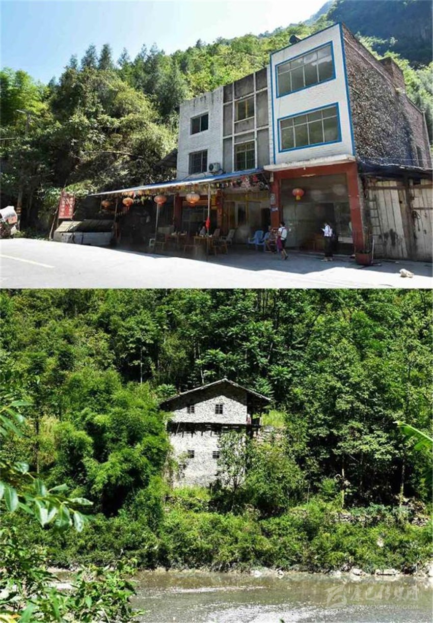 朱國富家的老屋(下)和現(xiàn)在居住的房子——家、店合一的“黑灣魚莊”。張可凡攝。