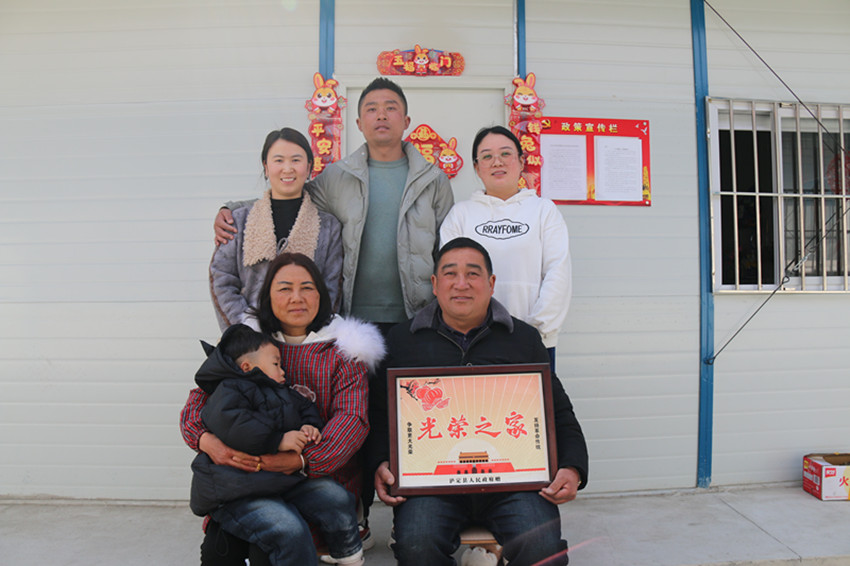 吃晚飯前,甘啟均叫上家里6口人,在板房門前拍了一張“全家?!保掌腥蚓o緊相偎,“光榮之家”的牌匾格外亮眼。