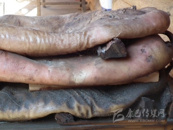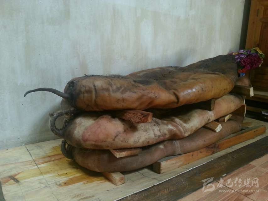 半干豬肉:在丹巴縣革什扎鄉(xiāng)有一種比較奇特的豬肉保存方法:將豬殺死后,不去毛,只在豬的腹部開一條口子取出內(nèi)臟,將血水清理干凈后用麻繩將腹部縫合。隨后用當(dāng)?shù)氐狞S泥漿敷在豬身上,在豬的身上形成一個(gè)厚約2厘米的殼,密不透風(fēng)。處理好后將其懸掛于灶塘之上,使黃泥在高溫的烘烤下快速硬化。如若發(fā)現(xiàn)黃泥層出現(xiàn)裂縫,立即用黃泥漿將其修復(fù)。等到第二年熱天時(shí),敲掉黃泥形成的硬殼,豬毛被輕松退去,豬肉依然比較新鮮。但這種保存新鮮豬肉的方法現(xiàn)在已經(jīng)很少見了,一是因?yàn)檫@種保存方法風(fēng)險(xiǎn)太大,稍有不慎豬肉就可能腐敗;二是如今物資供應(yīng)豐富,新鮮豬肉購買方便,使得此種儲(chǔ)存方式失去了存在的價(jià)值。