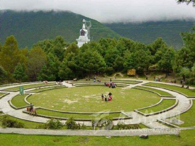 從康定城看跑馬山,景點(diǎn)林立,令人心馳神往。半山腰有長廊掩映在翠綠之中,引人注目。跑馬山腳有環(huán)山公路,自清真寺對(duì)面小巷拾級(jí)百余步,即至環(huán)山公路上山處,踏上水泥石階,蜿蜒林中石徑數(shù)百步,就看到飛云長廊了。迎面是陡立的寬約2米的石階。階頭,一對(duì)石獅踞于兩旁,笑迎足乏游人。入長廊在欄桿前坐下小憩,心神大爽,倦意全消。長廊依山巖建筑,大紅柱子撐起長廊的幽雅舒適,如入西湖曲廊回環(huán)中。再往下就是城中的高樓大廈以及彩虹橋、將軍橋和下橋了。爐城新姿及繁華,盡收眼底。晨夕,常有云霧來此流連而后離去,遇到云霧時(shí),游人會(huì)有仿佛在蓬萊仙境之感。
