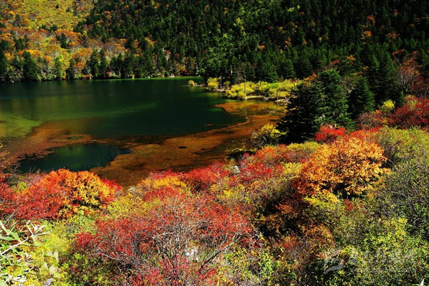 月牙形的七色海猶如一面五光十色的鏡片,鑲嵌在森林與草坪之間。叢林中百鳥輕歌曼舞,湖岸坪清幽秀雅,湖中水草飄逸,羌活魚在水底卵石中悠游,蕩舟穿霧興波,湖光山色眼底。環(huán)湖覽勝,“蓮花霧繞”、“蓮花夕照”、“駝峰倒影”等佳景襯托出七色海自然的靈趣,更兼那四時(shí)陽光雨霧變化莫測(cè),湖水呈現(xiàn)赤、橙、黃、綠、青、藍(lán)、紫多種色彩的奇觀,堪稱湖景一絕。