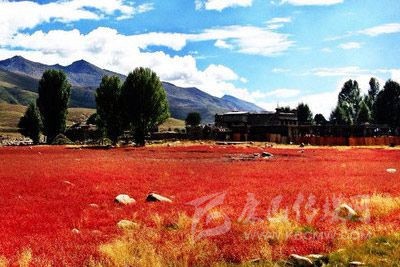 “紅草地”的后面是一個(gè)小村莊,村莊的周?chē)灿幸恍┌讞顦?shù),在秋風(fēng)的熏陶下大都已變成金燦燦的黃色?!凹t草地”的四周被幾座大山所環(huán)抱。晚秋中,五顏六色的大片色塊亮麗張揚(yáng)地組合在一起,水天同彩地纏綿出一幅斑斕、夸張、濃墨重彩的油畫(huà)山水。在黃綠相間的楊樹(shù)和藍(lán)天白云的映襯下,紅得特別的燦爛。一片只有足球場(chǎng)大的紅草地,每年只有十多天的風(fēng)光,是成了稻城一個(gè)標(biāo)志性景點(diǎn)。